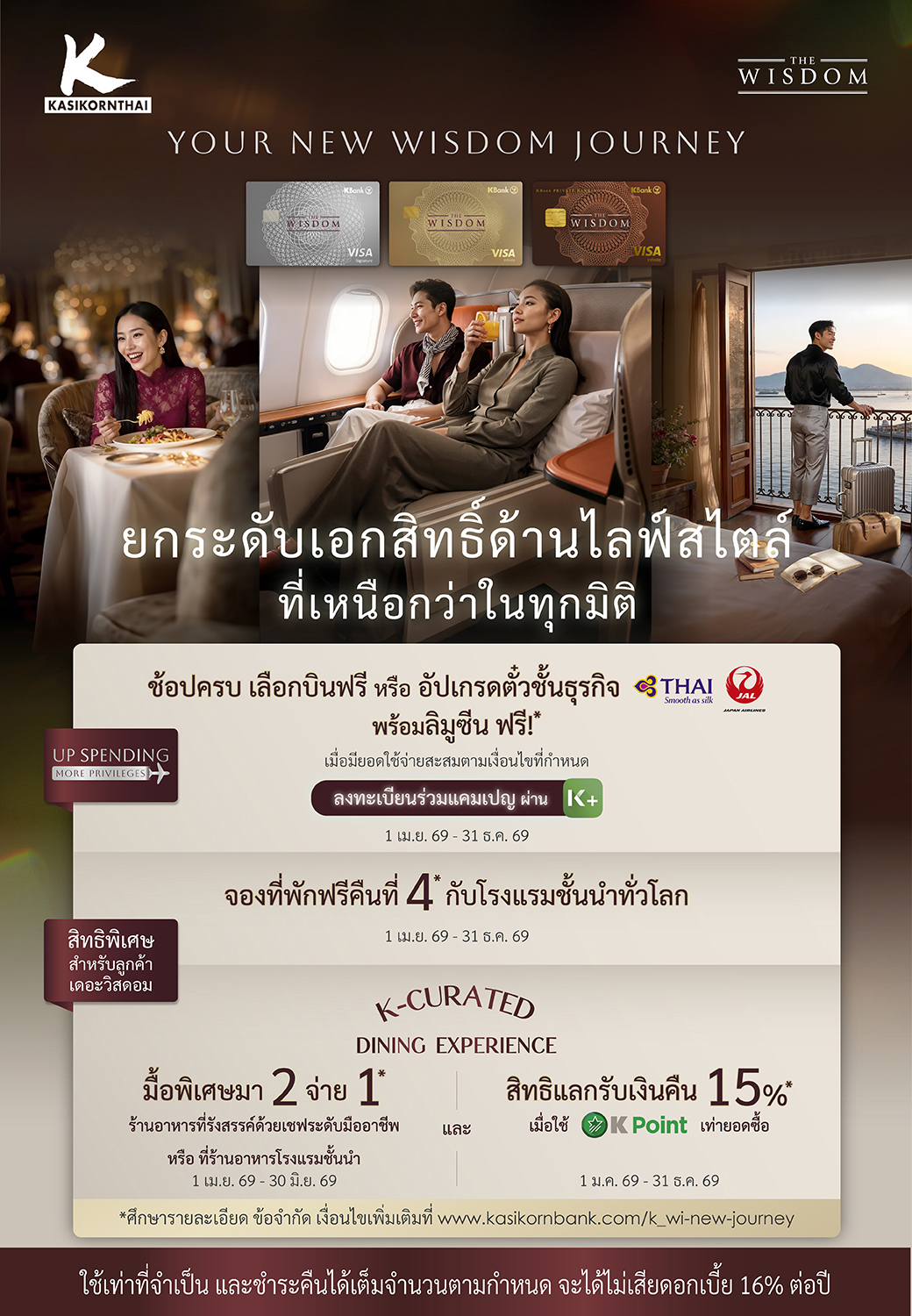 เดอะวิสดอมกสิกรไทย* (KBank THE WISDOM) เดินหน้าสู่ก้าวใหม่ของการยกระดับสิทธิพิเศษด้วยบัตรเครดิตเดอะวิสดอมกสิกรไทย ภายใต้แนวคิด “Your New WISDOM Journey” พร้อมอัปเกรดประสบการณ์ให้ตอบโจทย์ไลฟ์สไตล์ที่หลากหลายและมีความหมายยิ่งขึ้น จับมือกับ วีซ่า (Visa) มอบประสบการณ์เอ็กซ์คลูซีฟ ครอบคลุมทั้งการเดินทาง การพักผ่อน และการใช้ชีวิตระดับลักชูรี ผ่านแคมเปญ “UP SPENDING, MORE PRIVILEGES” ลูกค้าสามารถเปลี่ยนทุกการใช้จ่ายผ่านบัตรเครดิตเดอะวิสดอมกสิกรไทยให้เป็นประสบการณ์เอ็กซ์คลูซีฟ ครอบคลุมทั้งเลือกตั๋วเครื่องบิน หรือเลือกอัปเกรดสู่ชั้นธุรกิจ พร้อมบริการลิมูซีนรับ-ส่ง รวมถึงสิทธิพิเศษด้านการท่องเที่ยวและไลฟ์สไตล์ อาทิ พักฟรีคืนที่ 4 ในโรงแรมระดับเวิลด์คลาสทั่วโลก และประสบการณ์มื้ออาหารเอ็กซ์คลูซีฟกับ K-Curated Dining Experience พร้อมสิทธิพิเศษมา 2 จ่าย 1 และแลก K Point รับเครดิตเงินคืนสูงสุด 15% ระหว่างวันที่ 1 เมษายน 2569 – 31 ธันวาคม 2569