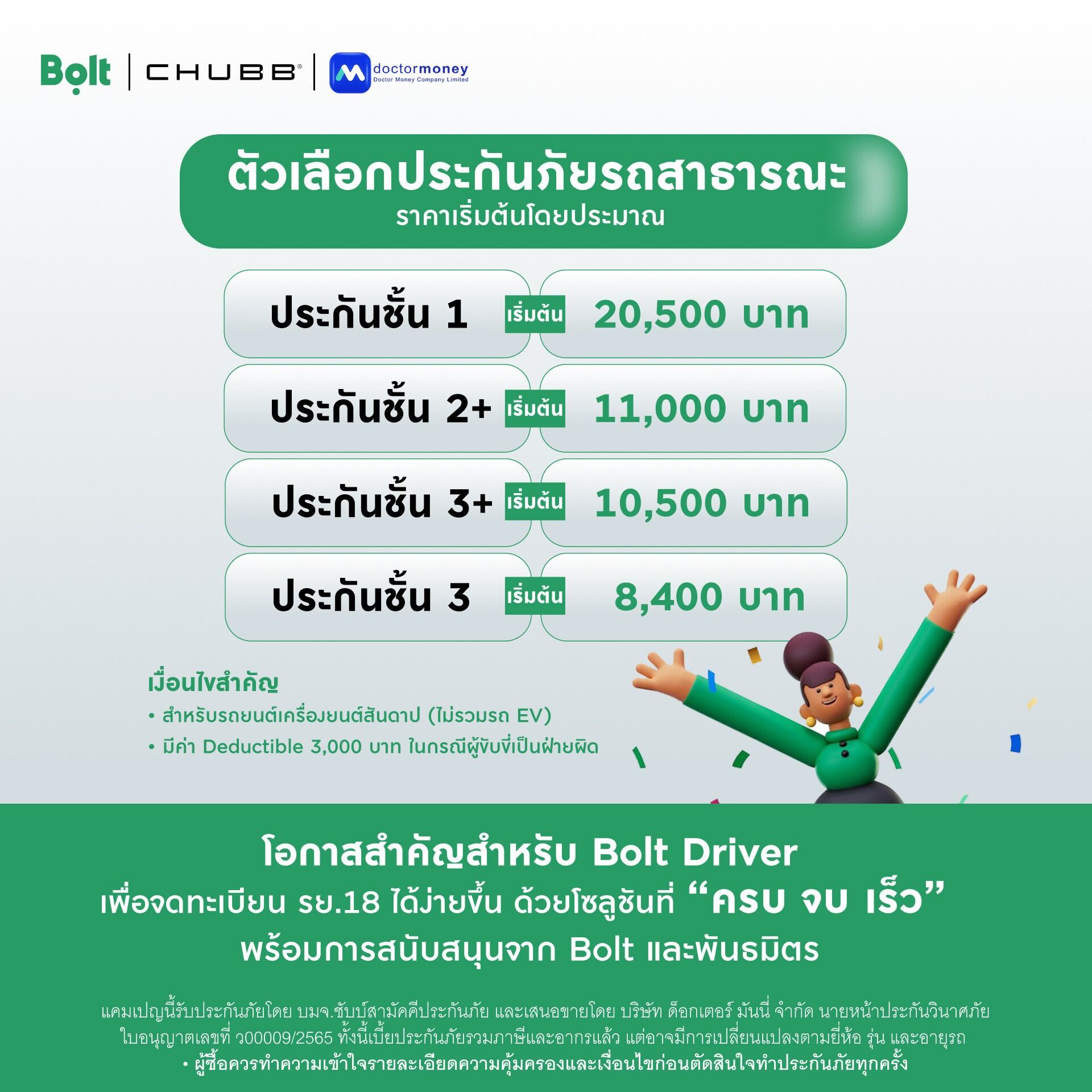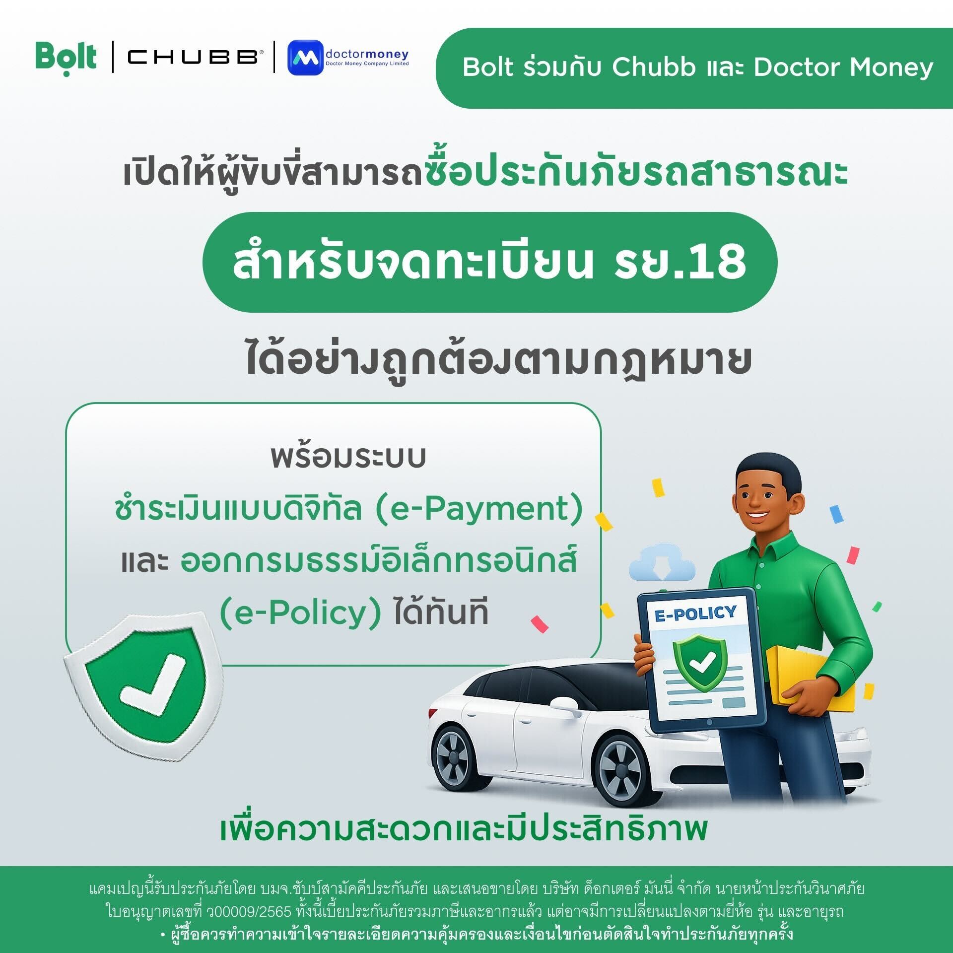 30 มีนาคม 2569 - โบลท์ (Bolt) ประเทศไทย ร่วมกับสมาคมธุรกิจเช่าซื้อไทย บริษัท ชับบ์สามัคคีประกันภัย จำกัด (มหาชน) และบริษัท ด๊อกเตอร์ มันนี่ จำกัด (Doctor Money) ประกาศความร่วมมือครั้งสำคัญ ภายใต้ “โครงการความร่วมมือด้านประกันภัย เพื่อสนับสนุนการจดทะเบียนรถยนต์สาธารณะ รย.18” โดยมีเป้าหมายเพื่อช่วยลดภาระต้นทุน และเพิ่มโอกาสให้ผู้ขับขี่สามารถเข้าสู่ระบบได้อย่างถูกต้อง สอดคล้องกับทิศทางการกำกับดูแลอุตสาหกรรม ride-hailing ของประเทศไทยที่กำลังก้าวเข้าสู่ช่วงการบังคับใช้กฎระเบียบอย่างเต็มรูปแบบ