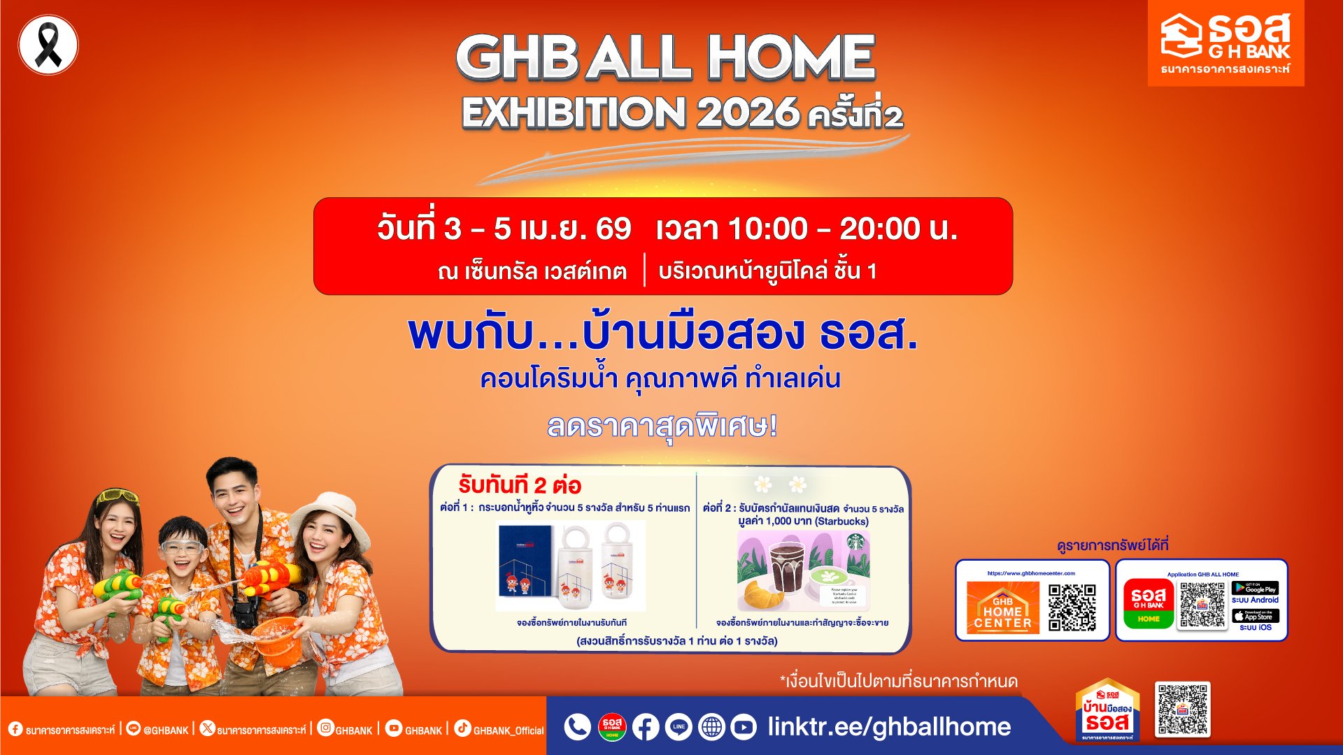 ธนาคารอาคารสงเคราะห์ (ธอส.) เดินหน้ากระตุ้นตลาดอสังหาริมทรัพย์ปี 2569 จัดโรดโชว์มหกรรมบ้านมือสอง GHB ALL HOME EXHIBITION 2026 ครั้งที่ 2 ระหว่างวันที่ 3 – 5 เมษายน 2569 เวลา 10.00 – 20.00 น. ณ เซ็นทรัล เวสต์เกต คัดสรรทรัพย์เด่น ทำเลดีทั่วประเทศ มาจำหน่ายในราคาคุ้มค่า พร้อมโปรโมชันพิเศษ เพื่อเพิ่มโอกาสให้ประชาชนมีที่อยู่อาศัยได้ง่ายขึ้น พิเศษ! 2 ต่อ ต่อที่ 1 ผู้ที่จองซื้อทรัพย์ภายในงาน 5 ท่านแรก รับทันที กระบอกน้ำหูหิ้ว และต่อที่ 2 ผู้ที่จองซื้อทรัพย์ภายในงานและทำสัญญาจะซื้อจะขาย รับบัตรกำนัลแทนเงินสด มูลค่า 1,000 บาท (บัตรสตาร์บัคส์) จำนวน 6 รางวัล (สงวนสิทธิ์ 1 ท่าน ต่อ 1 รางวัล) ภายในงานเท่านั้น นอกจากนี้ยังมีบริการให้คำปรึกษาสินเชื่อและเงินฝากสลากออมทรัพย์แบบ One-Stop Service ครบจบในที่เดียวอีกด้วย ทั้งนี้ งานครั้งต่อไปจะจัดขึ้นที่ เดอะมอลล์ บางกะปิ ระหว่างวันที่ 17 – 19 กรกฎาคม 2569 และเซ็นทรัล เวสต์วิลล์ ระหว่างวันที่ 16 – 18 ตุลาคม 2569 สอบถามข้อมูลเพิ่มเติมได้ที่ G H BANK Call Center โทร.0-2645-9000 กด 5 หรือ Facebook Fanpage บ้านมือสอง ธอส. หรือดูข้อมูลบ้านมือสอง ธอส. ได้ที่ www.ghbhomecenter.com Application : GHB ALL HOME และ Line Official Account : @GHBALLHOME