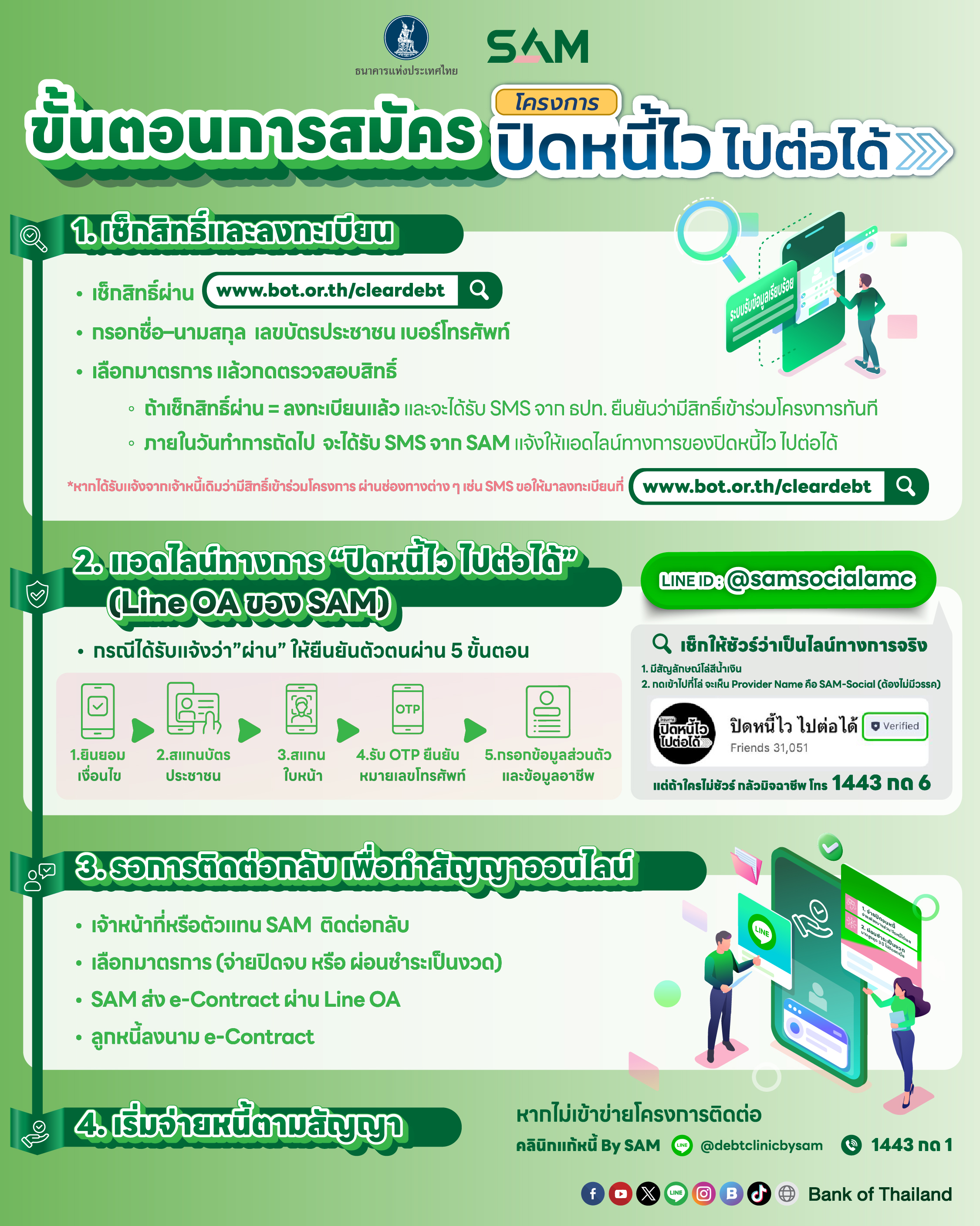 ทั้งนี้ ลูกหนี้สามารถตรวจสอบสิทธิ์เข้าร่วมโครงการได้ด้วยตนเอง แบบ “คลิกเดียวรู้ผลทันที” ผ่านช่องทางหลัก เว็บไซต์ ธนาคารแห่งประเทศไทย (ธปท.) www.bot.or.th/cleardebt และเว็บไซต์ บริษัท บริหารสินทรัพย์สุขุมวิท จำกัด www.sam.or.th เพียงกรอกข้อมูลส่วนตัว อาทิ ชื่อ-นามสกุล หมายเลขบัตรประชาชน หมายเลขโทรศัพท์ให้ครบถ้วน และหากลูกหนี้มีคุณสมบัติครบถ้วนตามเงื่อนไขทีกำหนด ระบบจะลงทะเบียนการเข้าร่วมโครงการให้โดยอัตโนมัติทันที! จากนั้นลูกหนี้จะได้รับการติดต่อผ่านทาง SMS จากธนาคารแห่งประเทศไทย และ SAM เพื่อยืนยันว่ามีคุณสมบัติตรงตามเงื่อนไขและสามารถเข้าร่วมโครงการได้ พร้อมระบุให้ลูกหนี้แอดไลน์ @samsocialamc และยืนยันตัวตน ซึ่งเป็นขั้นตอนสุดท้ายที่สำคัญ สำหรับ 5 ขั้นตอนการยืนยันตัวตนผ่าน Line@socialamc มีดังนี้ 1.กดยินยอม เพื่อเข้าสู่ระบบและกดยินยอมรับเงื่อนไขโครงการ 2. สแกนบัตรประชาชนและสแกนใบหน้า โดยถ่ายรูปบัตรประชาชนเพื่อยืนยันตัวตน 3. รับรหัส OTP เพื่อยืนยันหมายเลขโทรศัพท์ และ 4.กรอกข้อมูลส่วนตัว: ทำการตรวจสอบและยืนยันข้อมูลให้ถูกต้อง จากนั้นรอการติดต่อกลับจากเจ้าหน้าที่เพื่อเข้าสู่กระบวนการปรับโครงสร้างหนี้ เลือกมาตรการปรับโครงสร้างหนี้ ไปจนถึงการทำสัญญาและชำระเงินผ่านระบบออนไลน์ให้สำเร็จสมบูรณ์ต่อไป