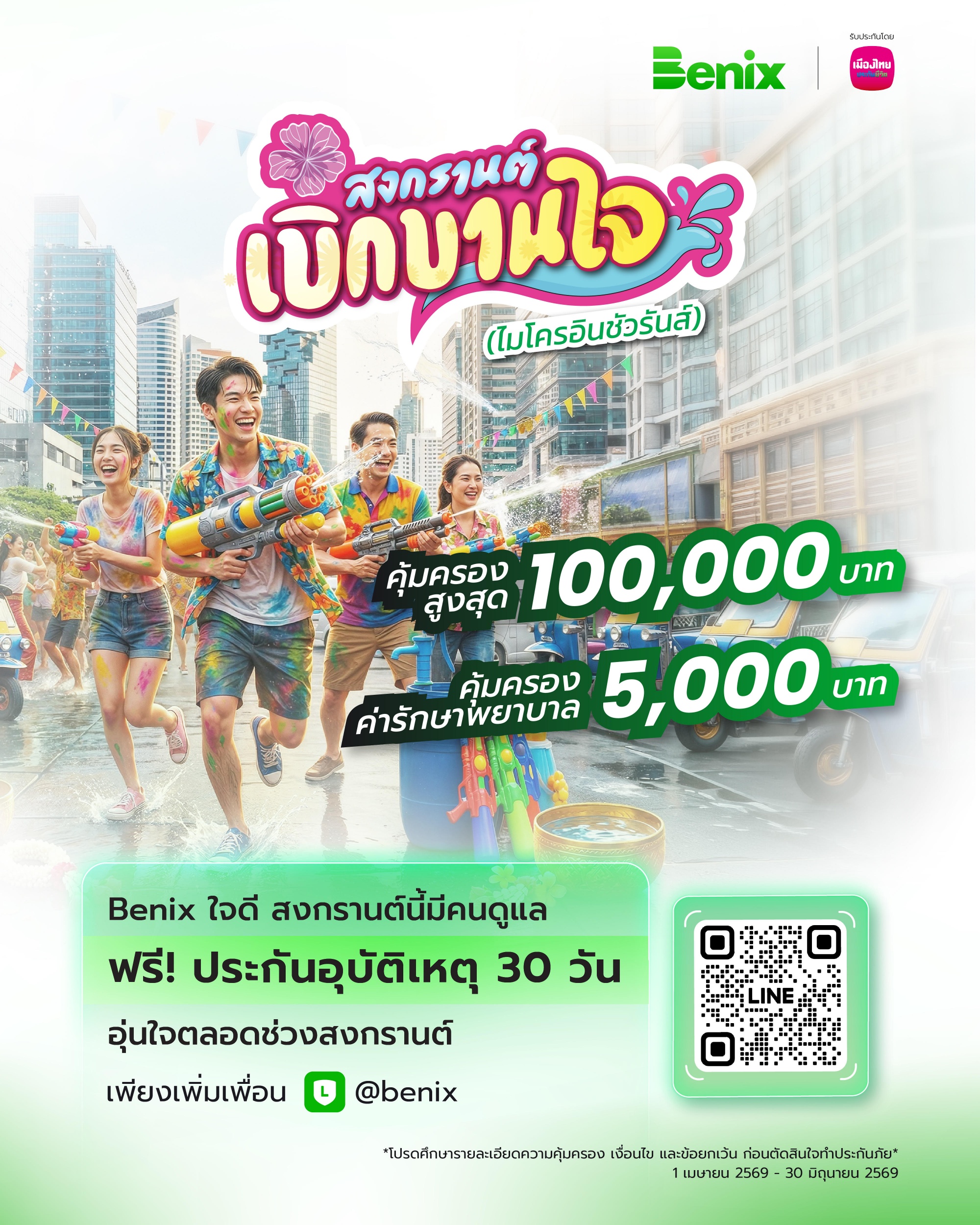 เมืองไทยประกันชีวิต จับมือ gettgo โบรกเกอร์ประกันออนไลน์ ส่งมอบความอุ่นใจตลอดช่วงสงกรานต์ ผ่าน “กรมธรรม์ประกันภัยสงกรานต์เบิกบานใจ (ไมโครอินชัวรันส์)” ประกันภัยอุบัติเหตุกลุ่มที่ให้ความคุ้มครองครอบคลุมทั้งด้านชีวิตและค่ารักษาพยาบาลเนื่องจากอุบัติเหตุ สูงสุด 100,000 บาท เพียงเพิ่มเพื่อนใน LINE Official Account @gettgo เริ่มตั้งแต่วันที่ 1 เมษายน 2569 – 30 มิถุนายน 2569