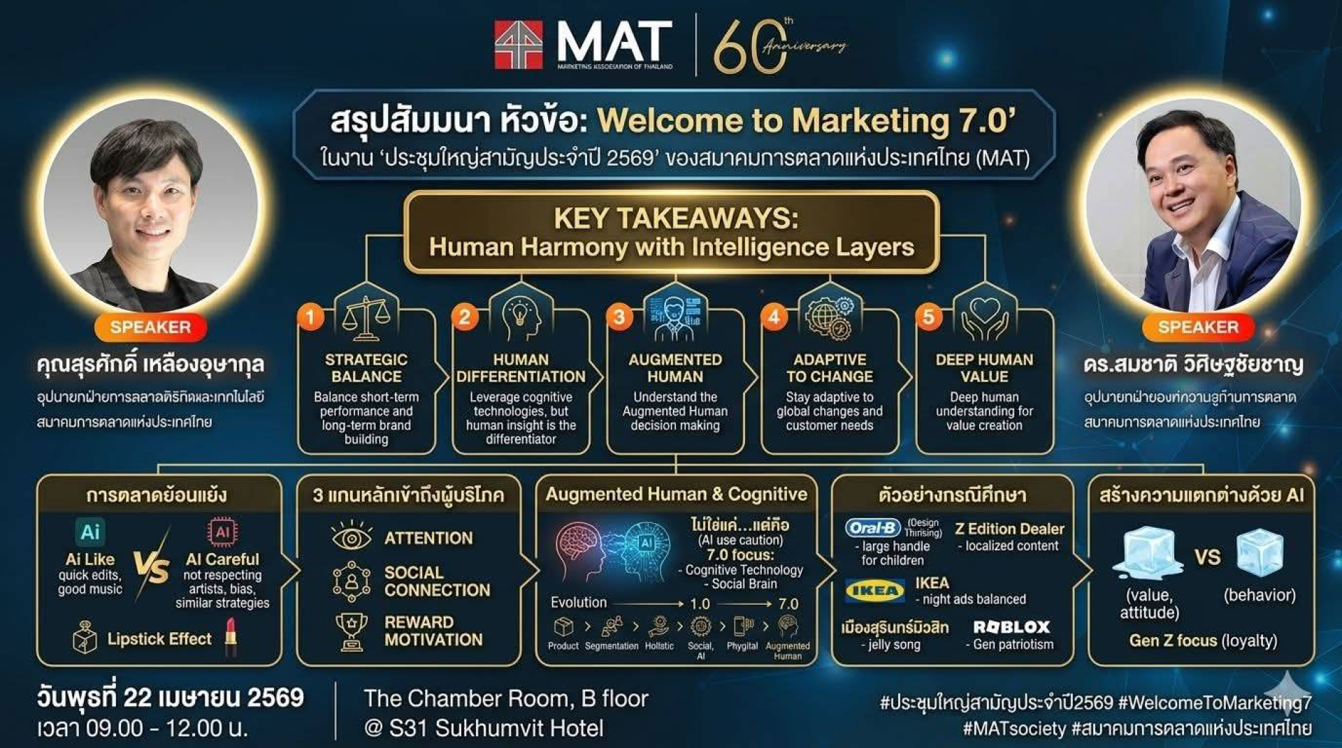 สมาคมการตลาดแห่งประเทศไทย (MAT) จัดงานประชุมใหญ่สามัญประจำปี 2569 พร้อมเปิดวงเสวนาหัวข้อพิเศษ "Welcome to Marketing 7.0" โดยได้รับเกียรติจากกูรูด้านการตลาดแถวหน้าของเมืองไทย ดร.สมชาติ วิศิษฐชัยชาญ อุปนายกฝ่ายองค์ความรู้ด้านการตลาด และ คุณสุรศักดิ์ เหลืองอุษากุล อุปนายกฝ่ายการตลาดดิจิทัลและเทคโนโลยี มาร่วมถอดรหัสทิศทางการตลาดโลกยุคใหม่ที่เทคโนโลยีและมนุษย์ต้องทำงานสอดประสานกันอย่างสมบูรณ์แบบ