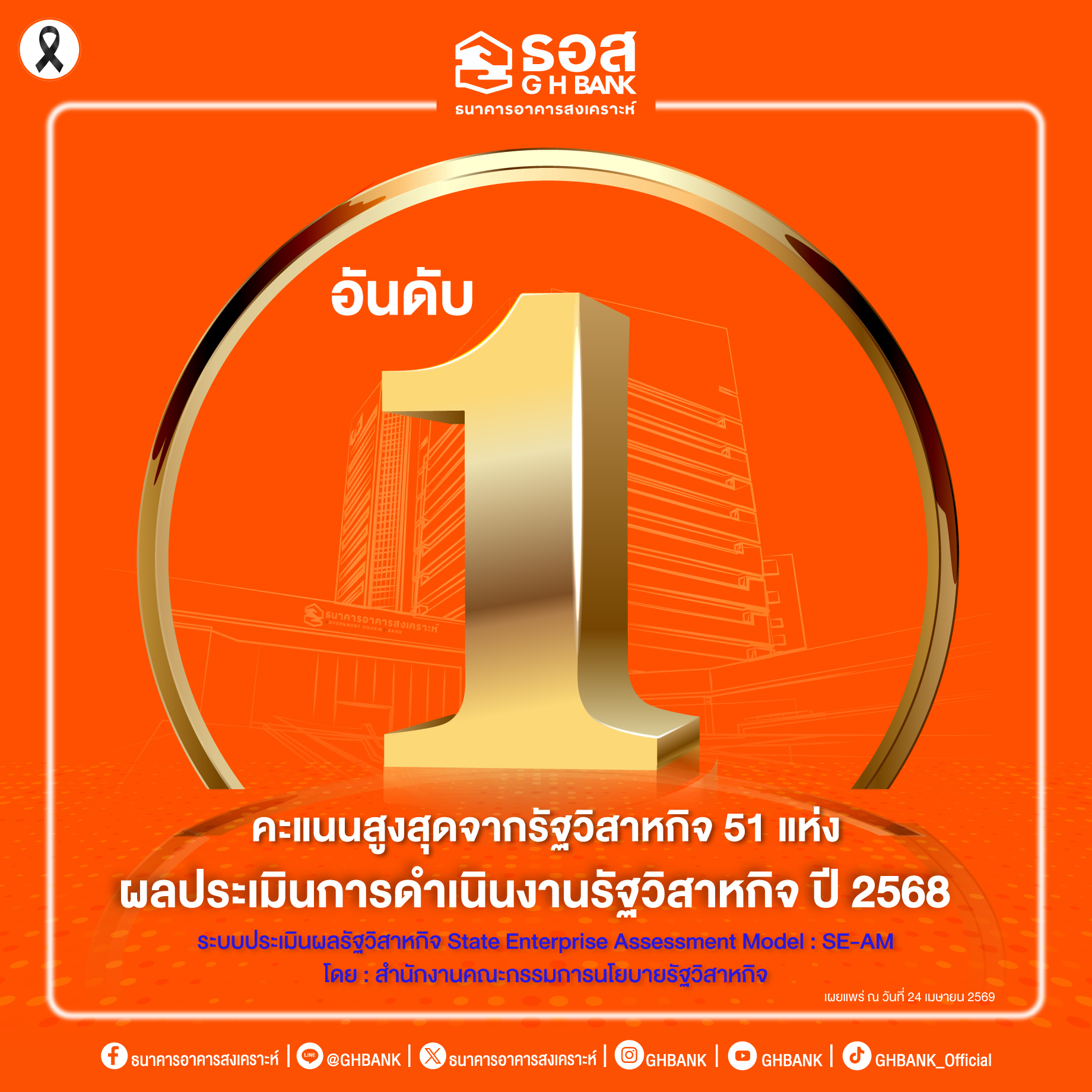 ธอส. คว้าอันดับ 1 ผลประเมินการดำเนินงานรัฐวิสาหกิจ ปี 2568 ด้วยคะแนน 4.5823