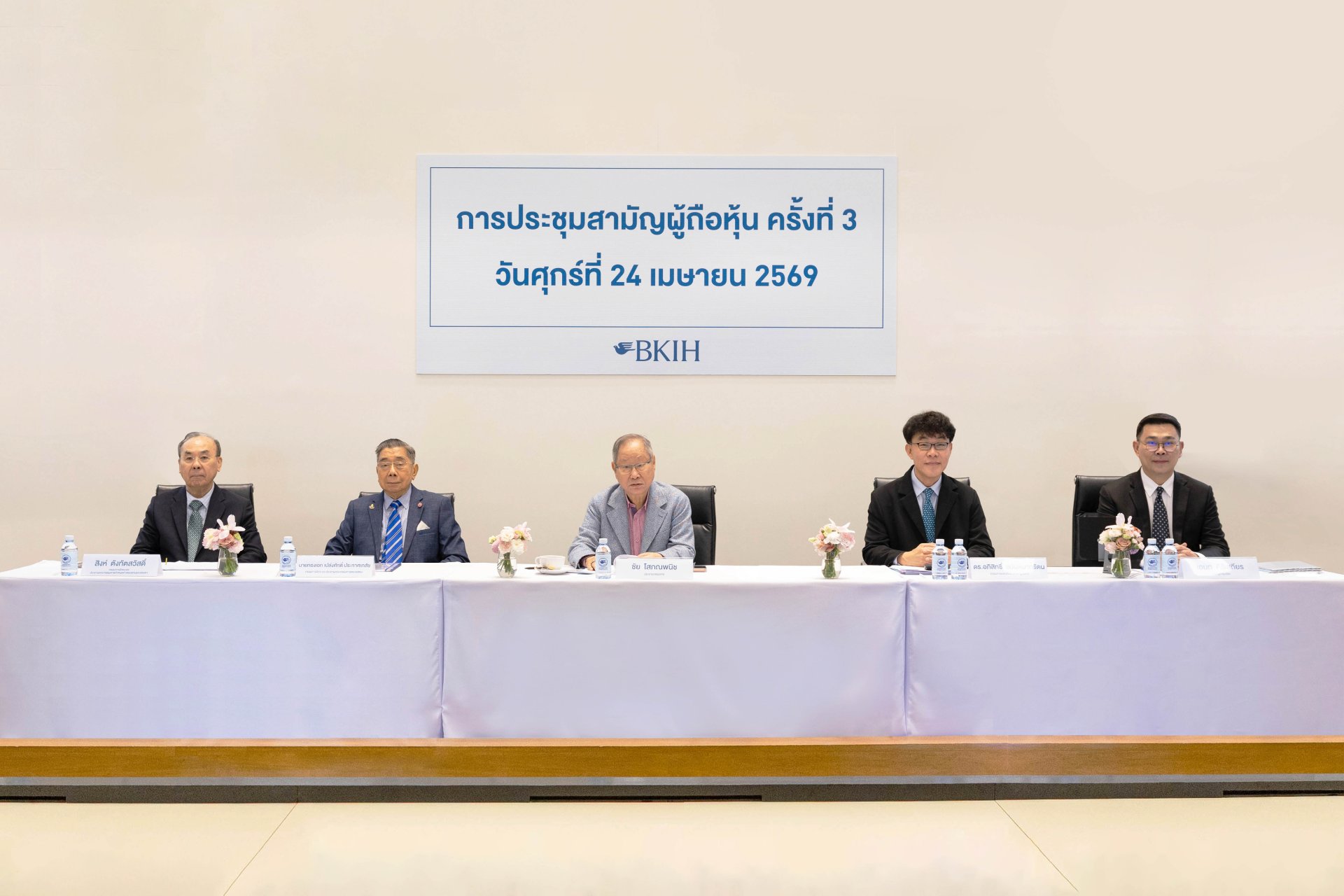 บริษัท บีเคไอ โฮลดิ้งส์ จำกัด (มหาชน) หรือ BKIH จัดประชุมสามัญผู้ถือหุ้น ครั้งที่ 3 นำโดยนายชัย โสภณพนิช (กลาง) ประธานกรรมการ พร้อมด้วยคณะกรรมการ (จากซ้ายไปขวา) นายสิงห์ ตังทัตสวัสดิ์ กรรมการอิสระและประธานคณะกรรมการกำหนดค่าตอบแทนและสรรหา นายกองเอก เปล่งศักดิ์ ประกาศเภสัช กรรมการอิสระและประธานคณะกรรมการตรวจสอบ ดร.อภิสิทธิ์ อนันตนาถรัตน กรรมการและประธานคณะผู้บริหาร และนายเอนก คีรีเสถียร เลขานุการบริษัท โดยที่ประชุมฯ มีมติอนุมัติเห็นชอบทุกวาระการประชุมตามที่คณะกรรมการเสนอ นอกจากนี้ ยังมีมติเห็นชอบแต่งตั้งกรรมการเพิ่มเติม จำนวน 3 ท่าน ได้แก่ นายชวาล โสภณพนิช นางสาวลสา โสภณพนิช และนางสาวปวีณา จูชวน ณ อาคารกรุงเทพประกันภัย สำนักงานใหญ่ ถนนสาทรใต้ เมื่อวันที่ 24 เมษายน 2569
