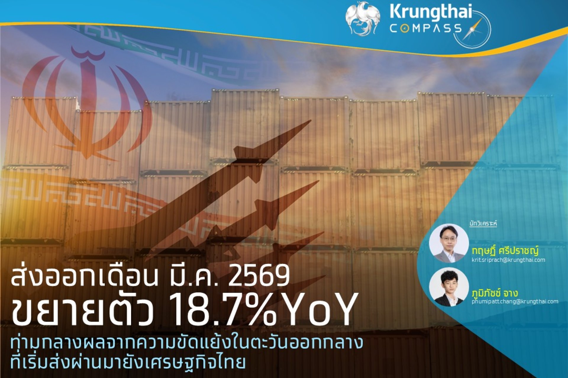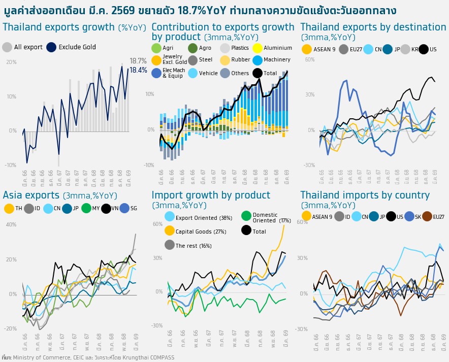 Krungthai COMPASS ประเมินว่า แม้การส่งออกเดือน มี.ค. 69 จะขยายตัวสูง แต่ผลกระทบจากความขัดแย้งในตะวันออกกลางเริ่มส่งผ่านมายังเศรษฐกิจไทยมากขึ้น ผ่านต้นทุนการนำเข้าที่สูงขึ้นและแรงส่งจากต่างประเทศที่อ่อนลง