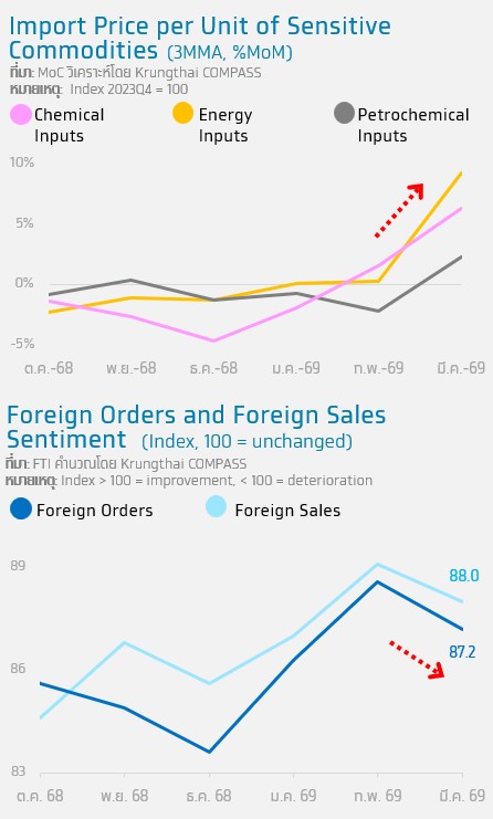 1) แรงกดดันด้านต้นทุนการผลิตของไทยเพิ่มสูงขึ้น สะท้อนจากราคานำเข้าต่อหน่วยของสินค้าอ่อนไหวต่อราคาน้ำมันหลายรายการในเดือนมีนาคมปรับสูงขึ้นเมื่อเทียบกับเดือนก่อน โดยเฉพาะกลุ่มพลังงาน (+9.2%MoM) กลุ่มปิโตรเคมี (+6.3%MoM) และกลุ่มเคมีภัณฑ์ (+2.4%MoM) อีกทั้งมีความเสี่ยงที่ต้นทุนวัตถุดิบมีแนวโน้มอยู่ในระดับสูงอย่างต่อเนื่อง จากการส่งผ่านของต้นทุนพลังงานไปยังวัตถุดิบ ค่าขนส่ง และต้นทุนตลอดห่วงโซ่การผลิต ซึ่งจะกดดันต้นทุนรวมของผู้ประกอบการไทย โดยเฉพาะกลุ่มพลาสติกและปิโตรเคมีที่มีสัดส่วนวัตถุดิบที่เกี่ยวเนื่องกับพลังงานและปิโตรเคมีคิดเป็นกว่า 40% ของมูลค่าวัตถุดิบรวม2