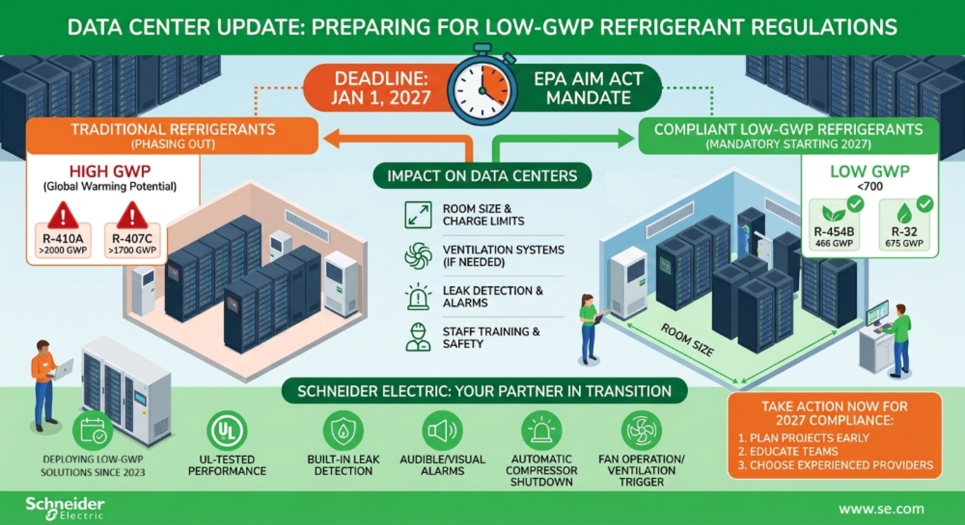 ชไนเดอร์ อิเล็คทริคไม่ได้เพิ่งเริ่มต้นรับมือกับผลกระทบของกฎข้อบังคับค่า GWP ต่ำ ในอุปกรณ์ทำความเย็นสำหรับดาต้าเซ็นเตอร์ แม้ว่าจะยังพอมีเวลาในการเตรียมตัว แต่ขอแนะนำอย่างยิ่งให้ผู้ที่ดูแลอุปกรณ์ทำความเย็น เริ่มพิจารณาวางแผนปฏิบัติการตั้งแต่ตอนนี้