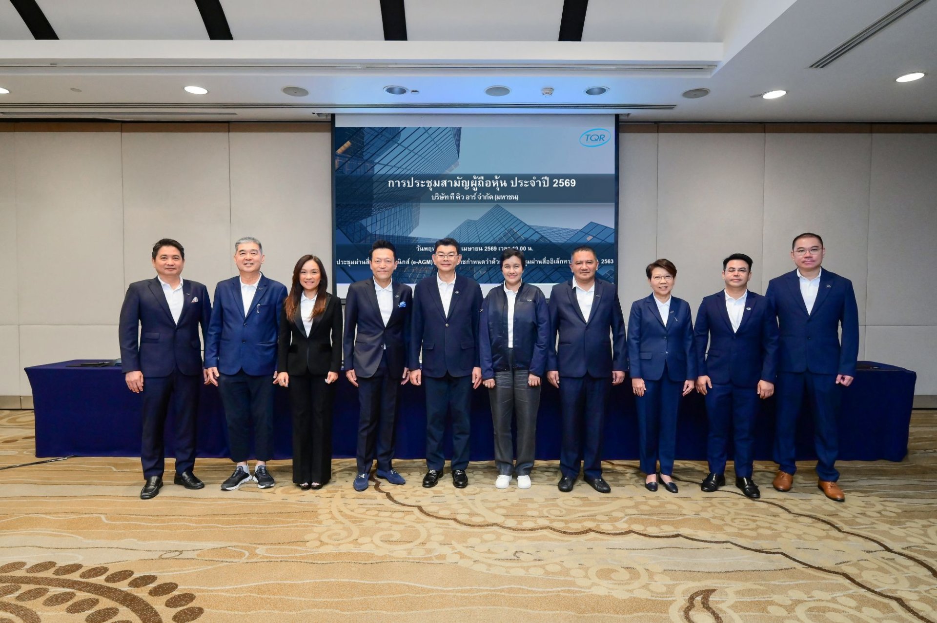 นายกฤษณะ บุญยะชัย (ที่ 5 จากซ้าย) ประธานกรรมการ, นายชนะพันธุ์ พิริยะพันธุ์ (ที่ 4 จากซ้าย) ประธานเจ้าหน้าที่บริหาร, นางยุพเรศ พิริยะพันธุ์ (ที่ 3 จากซ้าย) กรรมการและรองประธานเจ้าหน้าที่บริหาร พร้อมด้วยคณะกรรมการ บริษัท ที คิว อาร์ จำกัด (มหาชน) (TQR) เข้าร่วมการประชุมสามัญผู้ถือหุ้น ประจำปี 2569 ผ่านระบบสื่ออิเล็กทรอนิกส์ (E-AGM) โดยที่ประชุมมีมติอนุมัติจ่ายปันผลงวดประจำปี 2568 ในอัตราหุ้นละ 0.40 บาท รวมเป็นเงิน 92.00 ล้านบาท โดยจ่ายเงินปันผลระหว่างกาลแล้วในปี 2568 ในอัตราหุ้นละ 0.175 บาท คิดเป็นจำนวนเงิน 40.25 ล้านบาท ดังนั้น คงเหลือเงินปันผลที่จะจ่ายจากกำไรสุทธิ ประจำปี 2568 ในอัตราหุ้นละ 0.225 บาท คิดเป็นจำนวนเงิน 51.75 ล้านบาท กำหนดจ่ายในวันที่ 15 พฤษภาคม 2569 ทั้งนี้ บริษัทฯ มุ่งเน้นในการนำ AI มาพัฒนาระบบการทำงาน ทั้งในองค์กร และ การคิดค้นผลิตภัณฑ์ประกันภัยรูปแบบใหม่ ๆ เพื่อให้ทันต่อสถานการณ์ พร้อมตอบโจทย์ความต้องการของตลาดในปัจจุบัน งานดังกล่าวจัดขึ้น เมื่อเร็วๆ นี้